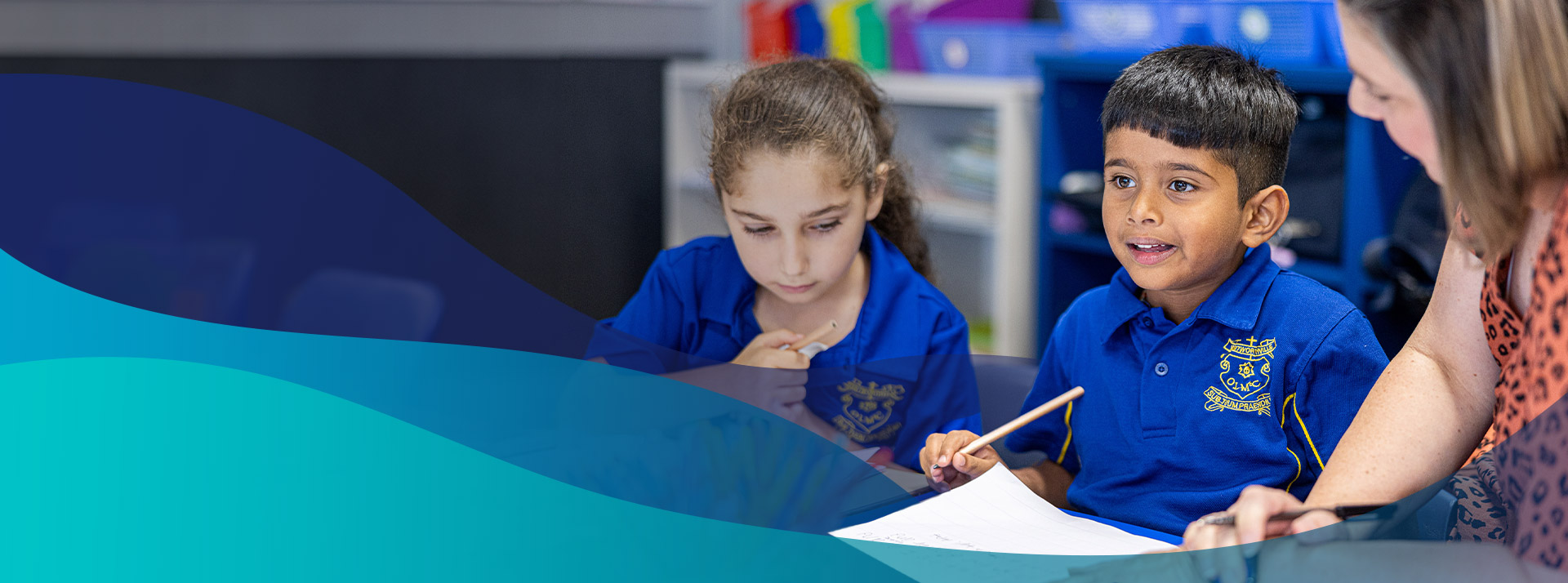 Teacher working with students to improve their writing skills at Our Lady of Mount Carmel Primary School Wentworthville